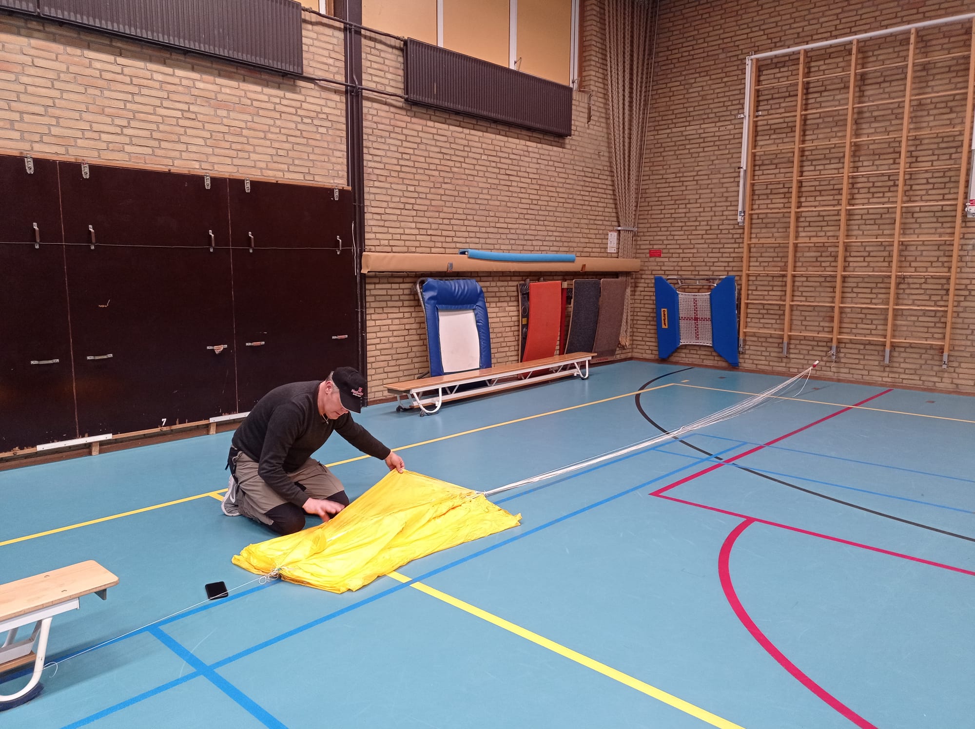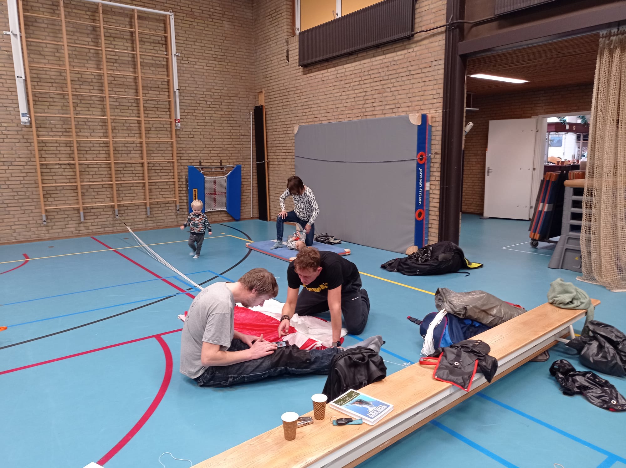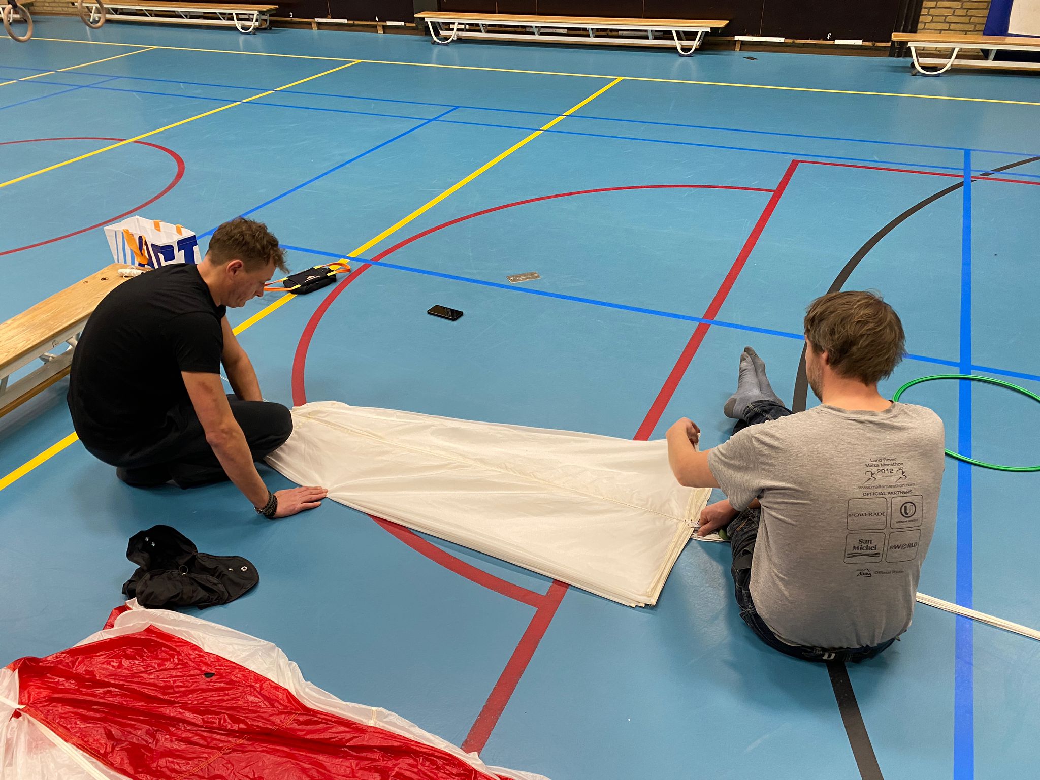 Begin van het seizoen, noodshute vouwen! Ron geeft uitleg hoe de lierkabel te lassen.